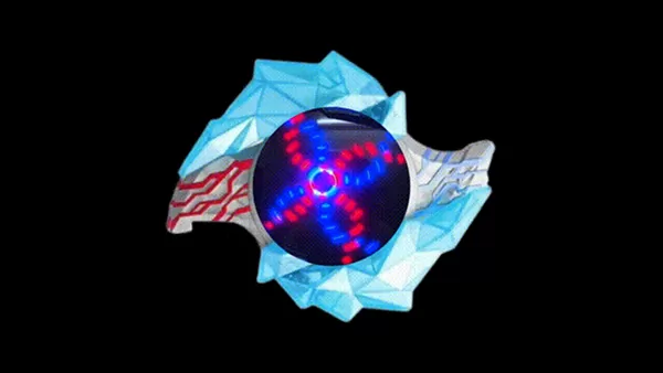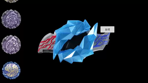 5、在变身过程里,中间的水晶会缓缓展开,进而露出显示屏,此时显示屏上会出现红色与蓝色圆圈相互旋转的画面,而且不同的晶石所呈现出的特效各不相同。