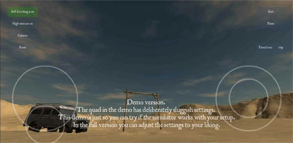 要熟悉界面布局:左侧设有四个功能按钮,作用分别是自动调平、低速率飞行、切换视角以及重新开始;右侧的选项则涵盖了退出游戏与暂停游戏这两项功能。