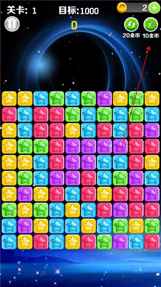 滑动玩法:向左或向右滑动方块,以此来生成和消除整行的星星方块。