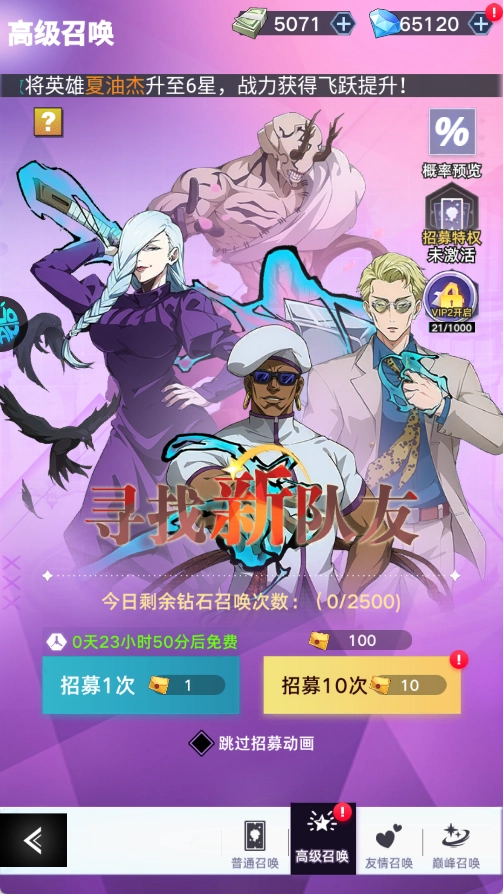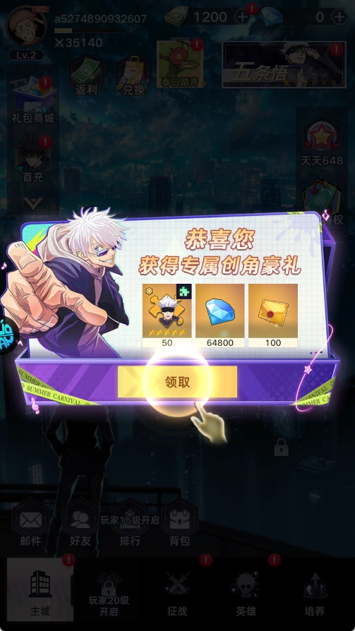 创建角色即可领取高人气SP英雄五条悟,还有64800钻石与100张高级招募券,帮助咒术师们清除所有咒灵