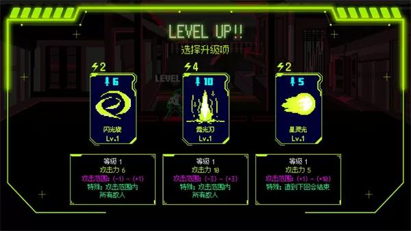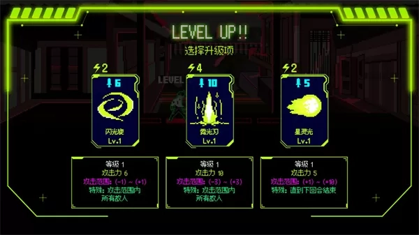 7、击败敌人可以获得灵魂和经验,提升等级后玩家可以从随机获得的卡牌里选择一个来使用,选择相同的卡牌可以提升威力。