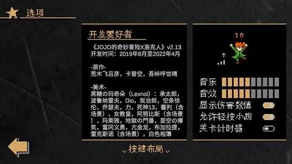 《JOJO的奇妙冒险克洛人》是一款巧妙融合《JoJo的奇妙冒险》与《洛克人》这两大经典IP的动作冒险游戏。玩家借助这款游戏,能够体验到像素风格、格斗对战、关卡挑战以及即时战斗等诸多精彩玩法。在《JOJO的奇妙冒险克洛人》中文版里,你还能够操控JOJO系列中的多位人气角色,引领他们一同完成所有关卡内容。