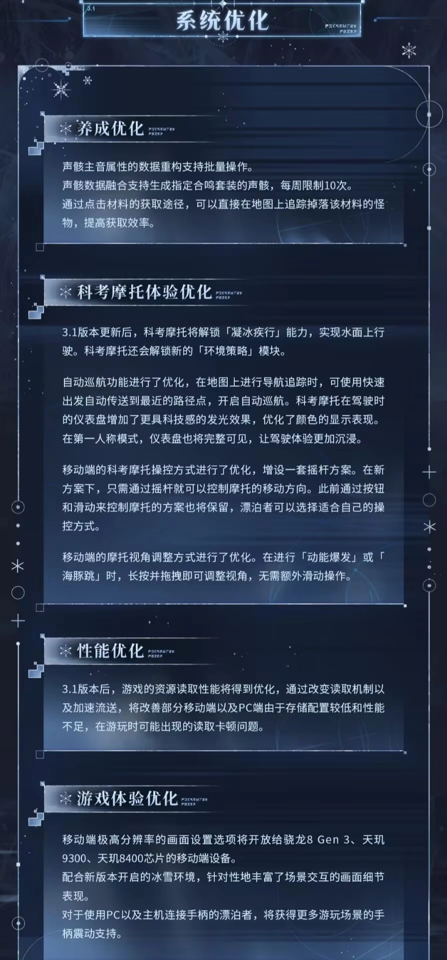 1、科考摩托:移动端操作、视角拖拽、自动巡航、视觉表现优化,新模块「凝冰疾行」(可以凝冰渡河了_[/闪亮])