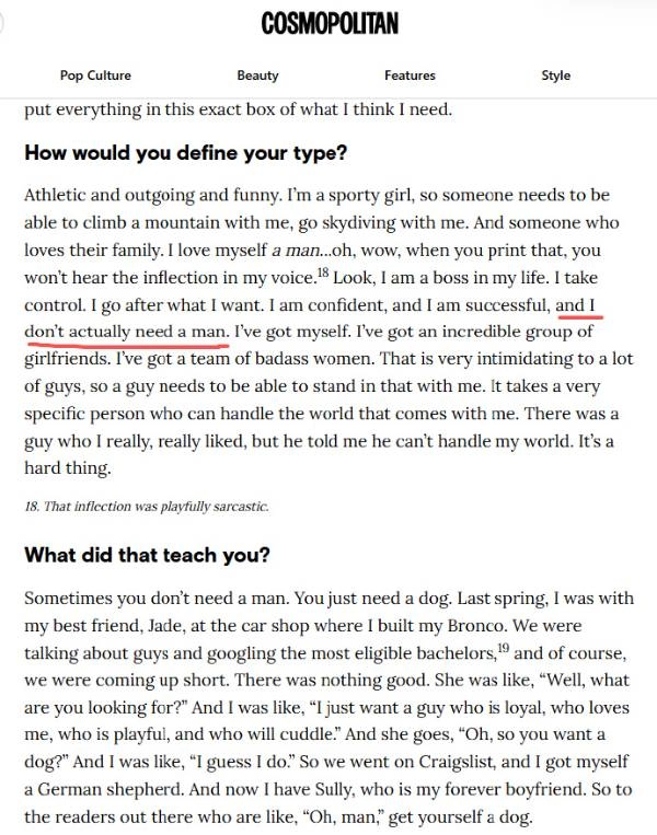 关于她说不需要男人的采访原文在这,大概翻译一下: