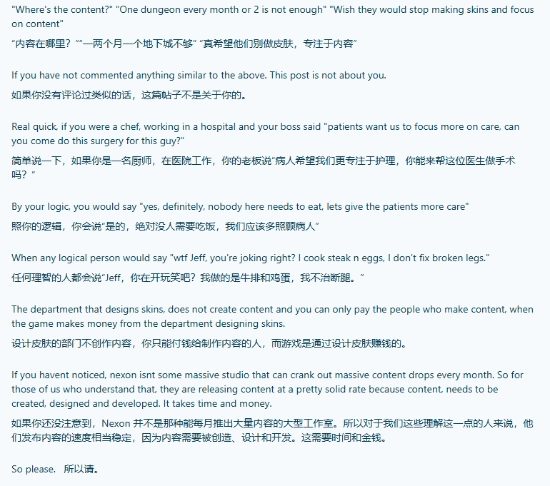 该玩家进一步解释称,皮肤销售是这类免费游戏(F2P)唯一的收入来源,只有皮肤卖得好,公司才有钱发给那些开发新内容的程序员。他呼吁玩家保持耐心:“Nexon并不是那种每个月都能甩出海量更新的大型工作室,内容的创造、设计和开发都需要时间和金钱。”