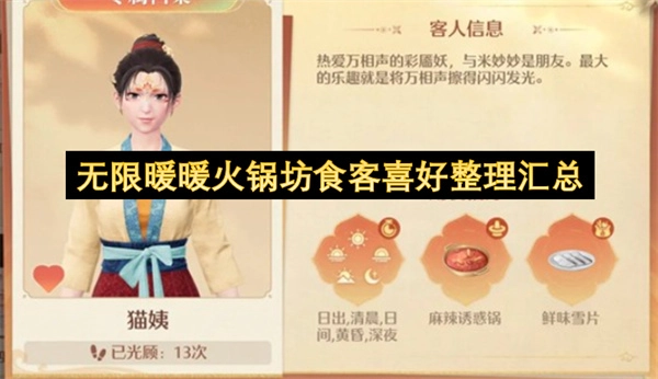 火锅坊是《无限暖暖》2.2版本「九色万相生」里的休闲经营类玩法。玩家可以用专属货币“万相通宝”来采购食材、升级火锅坊,还能通过满足食客的喜好来获取好感度与奖励。小编整理了一份《无限暖暖》火锅坊食客喜好的汇总内容,希望能给各位玩家提供帮助。