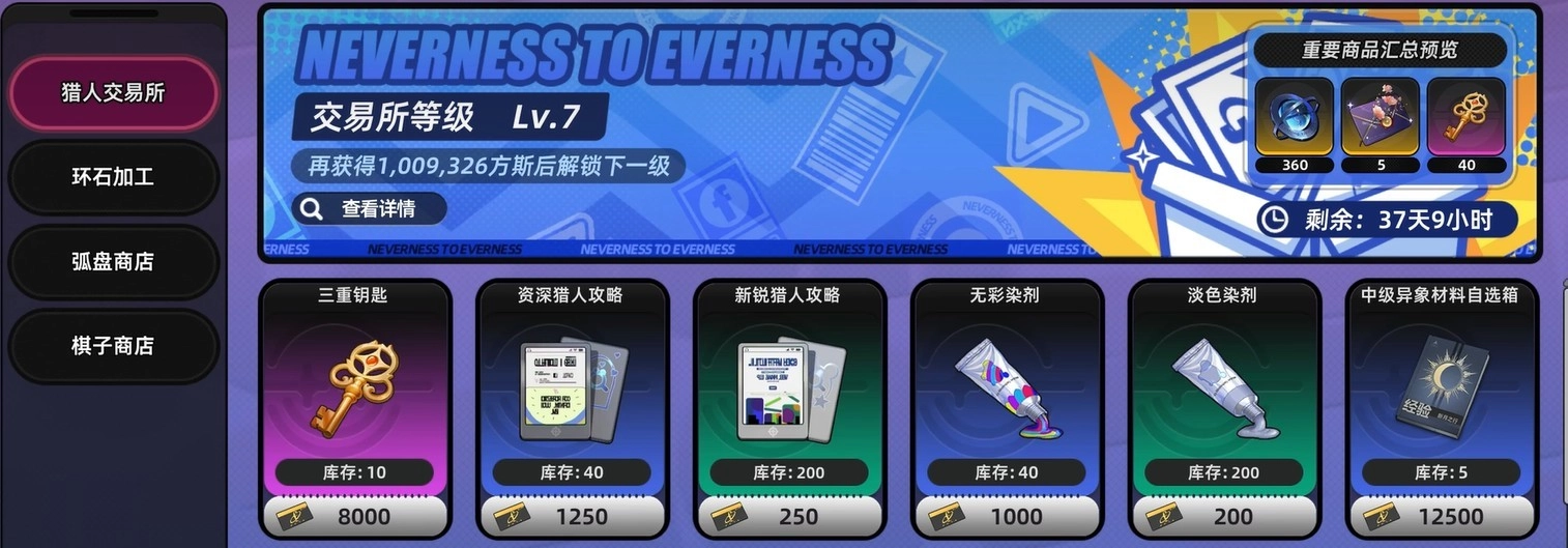 第二种是猎人交易所兑换,这个就比较直接了。用游戏里面的基础货币方斯就能换,而且上限很高,理论上可以直接把每期的钥匙额度拉满。方斯这个货币平时做日常任务、清体力都会掉落,积累速度还算可以。对于不想氪金又想稳定获取武器的玩家来说,这条渠道算是最靠谱的。