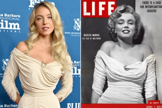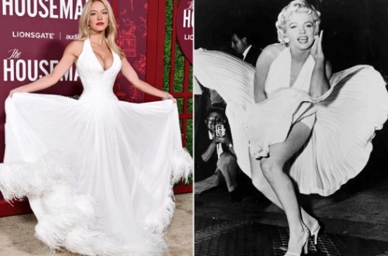 悉尼妹的造型师莫莉·迪克森确认,这个造型就是专门致敬玛丽莲·梦露的。事实上,这已经不是她第一次复刻梦露的造型了。2025年12月15日,电影《女佣》洛杉矶首映礼上,她穿了一件白色深V羽毛裙摆婚纱,重现了梦露电影《七年之痒》里被风吹起裙摆的名场面;今年1月,她为《W》杂志拍封面时,全裸出镜,只戴一条萧邦项链,金发卷发造型也和梦露的标志性风格高度契合。
