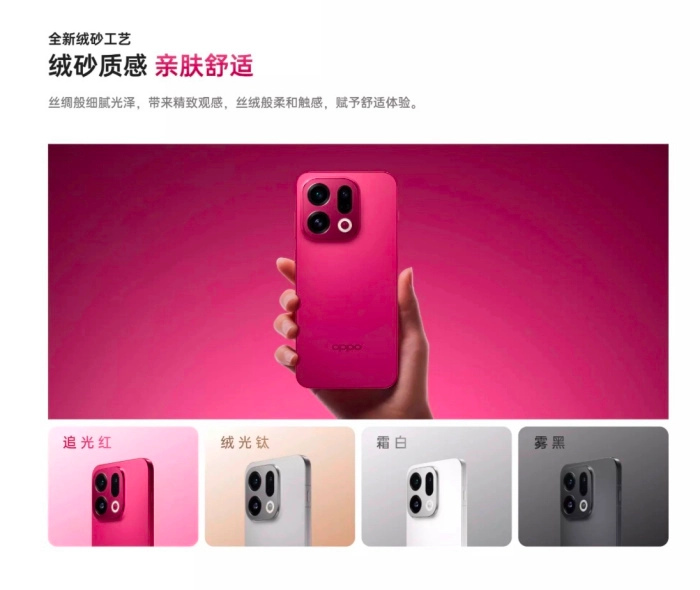OPPO Find X9的「追光红」配色首次运用创新“绒砂工艺”,让玻璃背板呈现出绒感金属光泽,在视觉与触觉层面都带来全新体验。该工艺通过在玻璃表面蚀刻微米级棱镜面晶坑,既保留了玻璃本身的通透光泽,又赋予了细腻亲肤的触感,同时还具备抗指纹的特性。