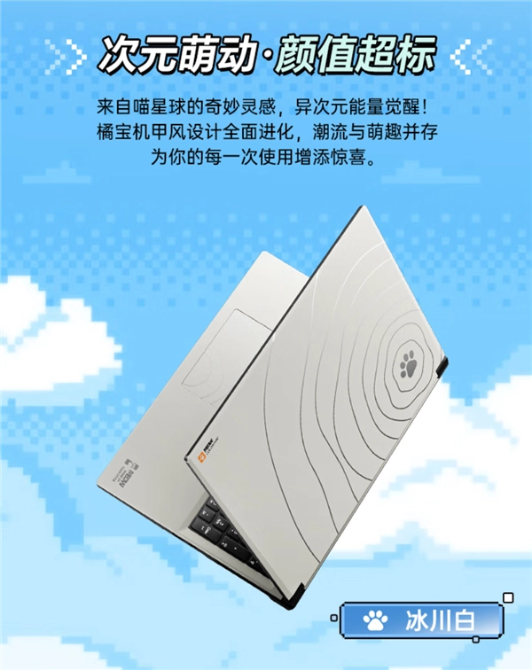 作为打破游戏本刻板印象的破圈产品,MEOW R16 Pro的外观设计深度融合萌趣与潮玩基因,精准戳中年轻用户对个性化、颜值化的追求,打破了“游戏本必硬核”的传统认知。作为行业首创以萌宠为题材的潮玩IP游戏本系列,将橘宝萌猫IP贯穿产品始终,整机采用纯净冰川白配色,A面搭配萌系猫爪印与涟漪波纹设计,在磨砂工艺加持下,触感温润且不易沾染指纹,将人文温情与科技质感、潮流美学完美融合。机身C面采用熊猫配色,搭配与A面呼应的“喵之涟漪”触控板,此外可搭配MEOW系列专属橘宝卡通贴纸,自定义装饰机身,打造独一无二的个人潮玩装备,彰显年轻玩家的潮玩态度。