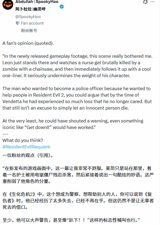 《生化危机》系列的粉丝们对《生化危机9:安魂曲》里里昂的角色设定心存顾虑,这源于一段刚发布的游戏视频片段:里昂在一家医院内和一名护士对话时,护士因即将出现的僵尸陷入恐慌,就在她打算逃离之际,一名变成僵尸的医生用电锯残忍地将她杀害,可里昂自始至终都没有采取任何行动。