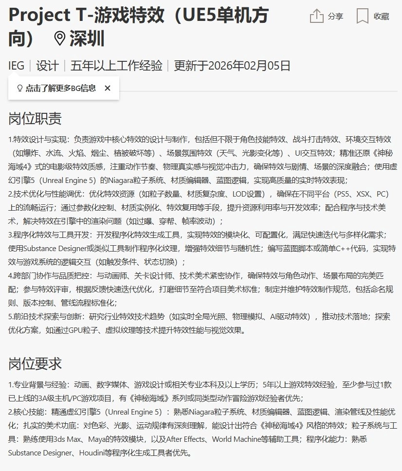 根据岗位描述,《Project T》是一款采用UE5引擎开发、面向单机平台的3A级主机/PC游戏,当前正处于团队搭建的早期阶段。在招聘需求中,特效、动画等岗位均提出“需至少参与过1款已上线的3A级主机/PC游戏项目”的要求,同时特别注明“拥有《神秘海域》系列或同类动作冒险游戏项目经验者将被优先考虑”。