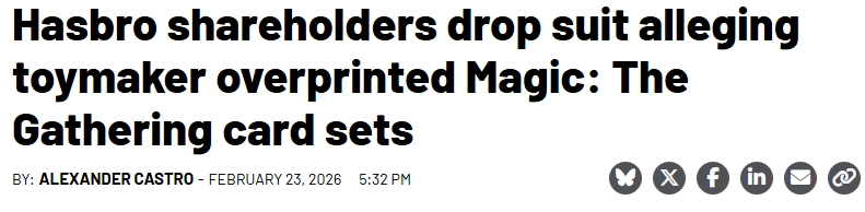 1月21日,美国玩具业巨头孩之宝的两位大股东Joseph Crocono和Ultan McGlone提起诉讼,指控该公司旗下经典集换式卡牌游戏万智牌的营销策略存在问题——新卡牌包推出节奏过快、频率过高,这一做法已对股东利益造成严重损害。