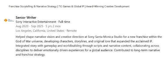 根据一位曾在索尼圣莫妮卡任职的高级编剧的领英个人资料截图显示,该编剧在索尼圣莫妮卡工作了五年,期间主要负责“为《战神》宇宙下的全新系列(franchise)构建叙事愿景与创意方向,开发角色、故事线,并拓展这一备受赞誉IP的原创世界观设定”。
