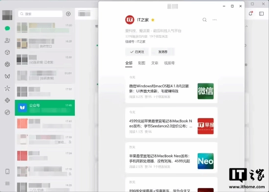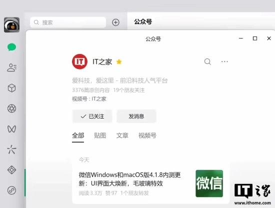 还记得在之前的 PC 4.1.4 版本中,微信就曾对主界面进行优化,添加了毛玻璃效果,适配 Windows11 24H2 及以上版本。