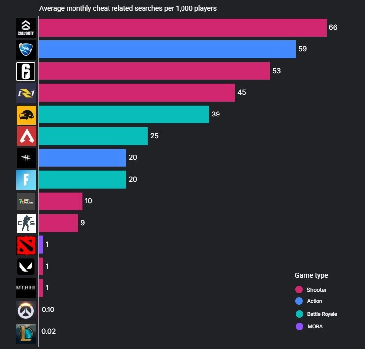 在作弊搜索量排名中,仅次于《使命召唤》的是《火箭联盟》。这也是“作弊搜索量最高的15款游戏”榜单中,唯一一款体育类游戏。而《反恐精英》《Dota2》《无畏契约》《英雄联盟》等均排在榜单末尾。《使命召唤》每1000名玩家有66次作弊相关搜索,而《英雄联盟》只有0.3次。