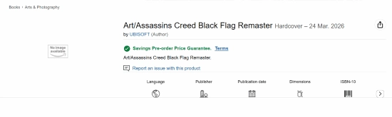近日观察到,亚马逊英国站之前上架的《刺客信条:黑旗 复刻版》艺术设定集页面出现了变化:原本标题中标注的“黑旗重制版”已被修改为“未命名”,而发售日期也从2026年3月24日延后到了2027年12月31日。