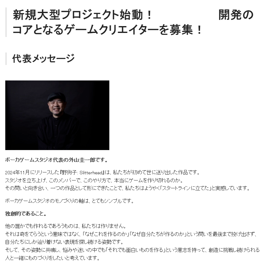 “我是Bokeh Game Studio的CEO外山圭一郎。”他在信中这样写道,“2024年11月推出的《野狗子》是我们团队的首部作品。开发过程中我们曾反复自问:‘凭借这样的模式、这样的团队和这样的创作方式,我们真的能完成一款游戏吗?’当我们正视这个疑问,将所有努力凝聚成最终的作品时,我们才真切地感觉到,自己终于站在了真正的起点上。”