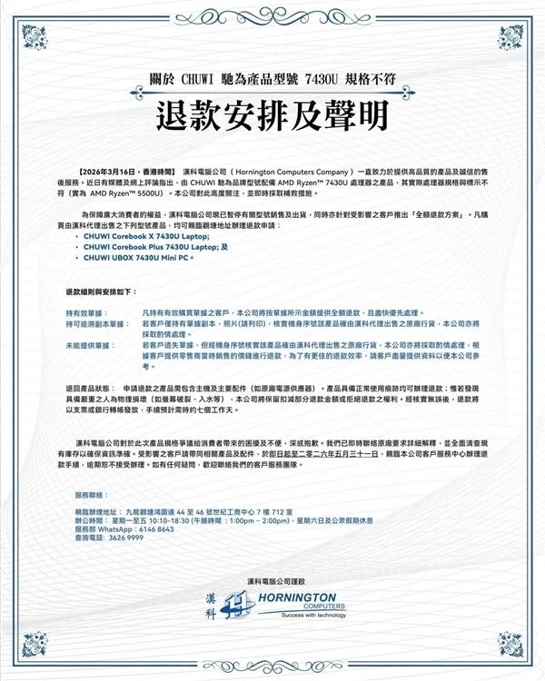 3月17日消息,香港代理商汉科Hornington近日发布公告,指出国产厂商驰为的3款搭载AMD 7430U处理器的产品,实际CPU规格为AMD 5500U,与宣传不符。