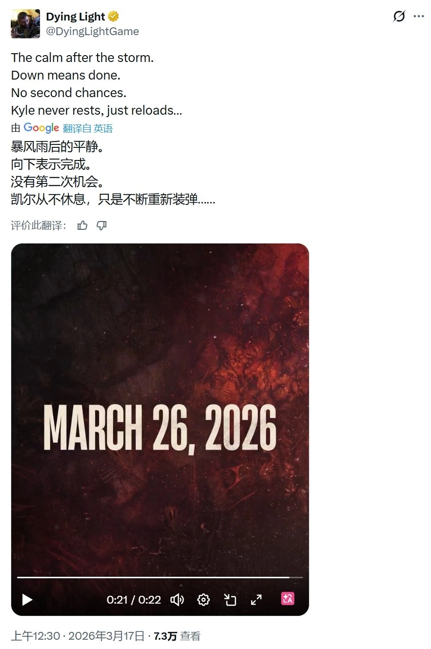 Techland工作室的热门游戏《消逝的光芒:困兽》或许很快会迎来一次重要更新。官方近期在社交平台发布了一段神秘视频,暗示新内容将在3月26日公布,这让玩家群体对“永久死亡”等高难度模式展开了热烈猜测。