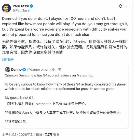 针对网友的质疑,打出高分的 Paul Tassi 罕见地发文回应,揭示了《红色沙漠》恐怖的体量:Paul 表示自己已经投入了整整 100 小时 的游戏时长,但依然没有完成主线通关。他认为自己选择像大多数普通玩家那样去深度探索世界,而非强行推主线。