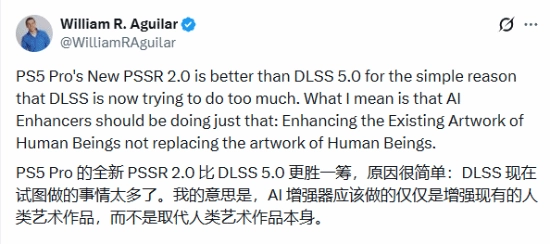 近日,PS5 Pro所搭载的全新PSSR2.0超分技术引发了大量讨论,不少业内人士纷纷就此发表了自己的看法。分析师WilliamR.Aguilar也公开表达了观点,他认为PS5 Pro的PSSR2.0效果要优于DLSS5.0。