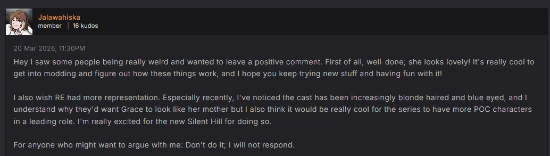 这一MOD也获得了一部分玩家支持。有用户留言称:“看到有人对此反应过激,我想留下点正面的评价。做得很好,角色看起来很棒!能开始尝试制作MOD本身就很酷,希望你继续探索、玩得开心。”