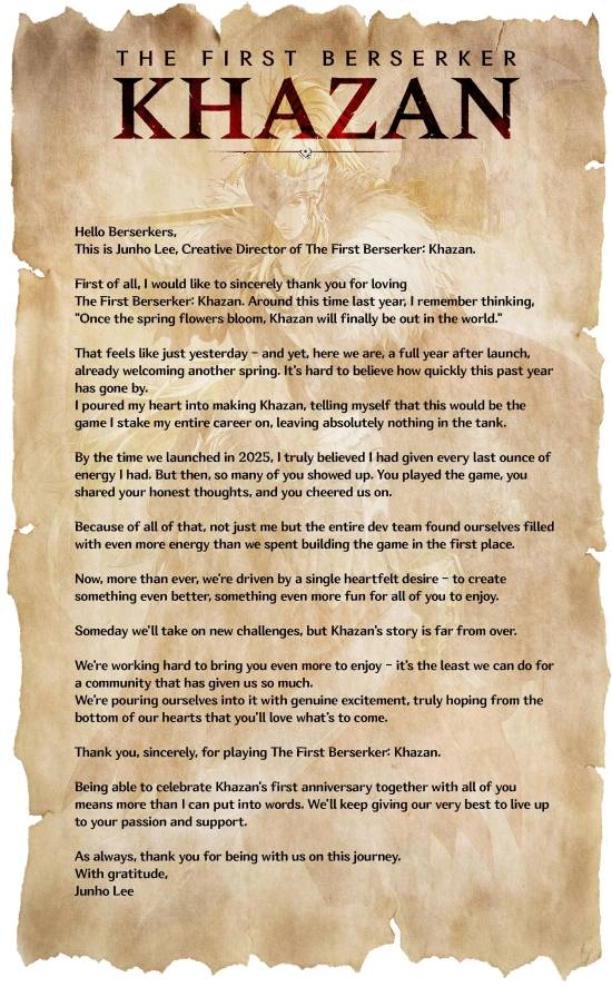 李俊浩在信里回忆,去年春天那款游戏刚推出时,他一度觉得自己已经把所有心血都投入进去了。可没想到玩家们的热情和支持,反而给团队带来了“比开发阶段还要多的能量”。他饱含深情地写道:“卡赞的故事还远远没有结束。我们正带着满满的兴奋劲儿在努力,就是希望能为大家带来真正让你们喜欢的新内容。”