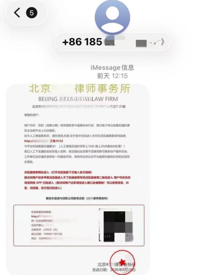 据介绍,骗子利用苹果设备iMessage功能,向受害人发送伪造的“贷款逾期催收律师函”图片,图片内容为虚构的贷款逾期将面临司法诉讼的威胁信息。