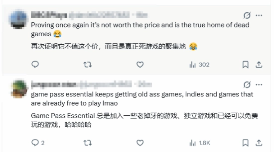 这条动态发布后,许多玩家都来分享自己的观点。部分玩家觉得Xbox Game Pass的表现再次说明订阅价格并不划算,平台甚至成了冷门游戏的集中地。还有玩家抱怨Game Pass Essential总是上线老游戏、独立游戏,其中不乏本身就是免费游玩的作品。