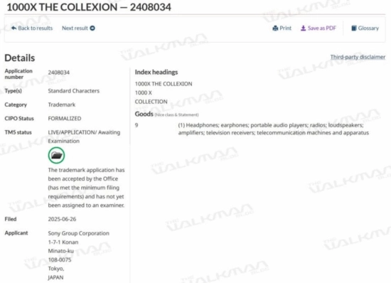 据介绍,早在2025年8月,TheWalkmanBlog网站就在日本和加拿大留意到一项耐人寻味的商标注册——“1000X THE COLLEXION”。“1000X”明显对应索尼的高端音频系列,像WH-1000XM6耳机或WF-1000XM6耳机,但目前还不清楚这是耳机、耳塞还是智能音箱。