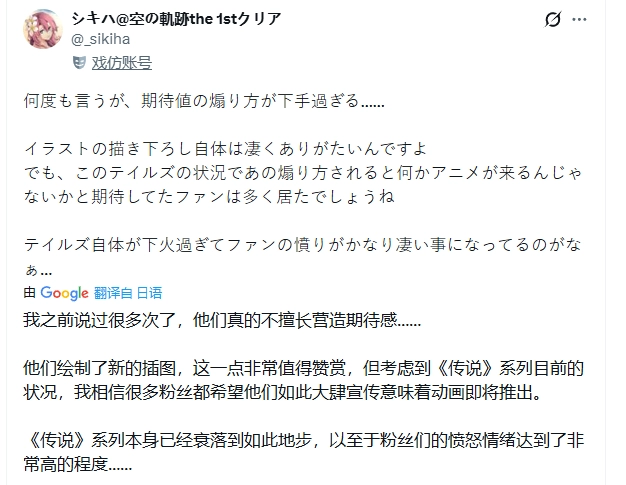 然而,这一消息在日本玩家群体中激起了强烈不满。争议的核心并非内容本身,而是宣传手段。玩家觉得,官方通过一个“预告的预告”以及连日的倒计时进行大肆预热,充分调动了大家的期待。鉴于《传说》系列已有五年未推出正统新作,且此次合作涉及两家动画巨头,许多玩家都期盼能至少听到新游戏或新动画的相关信息。可最终等来的却是插画和音乐会,这种心理落差让不少人觉得自己被欺骗了。