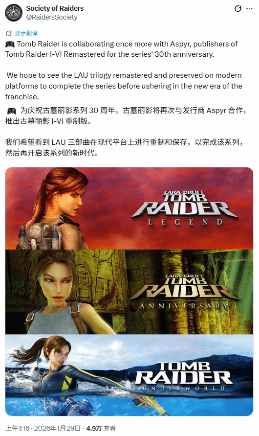 此前,爆料渠道“Society of Raiders”曾透露,Aspyr或许正为该系列30周年筹备相关项目,从现有线索来看,大概率是针对“LAU三部曲”的重置计划,具体包含《古墓丽影:传奇》《古墓丽影:十周年纪念版》以及《古墓丽影:地下世界》这三部作品。
