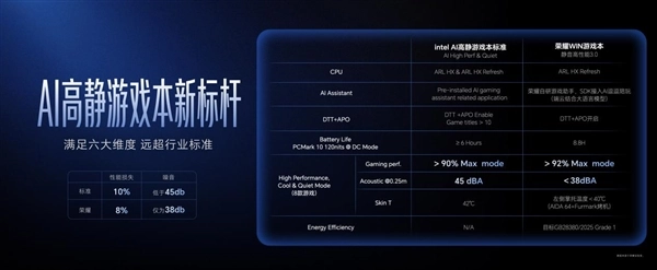 同时,荣耀自研静音高性能模式3.0在畅玩3A大作时将噪音控制在38dB以下,荣耀称该模式在六大维度上超越行业标准。