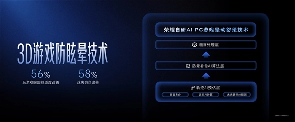 在游戏体验优化方面,荣耀推出了行业领先的3D游戏防眩晕技术,利用AI轨迹预测与自研晕动补偿算法,通过荣耀绿洲实验室测试验证,游戏眼部舒适度改善56%,迷失方向感改善58%。