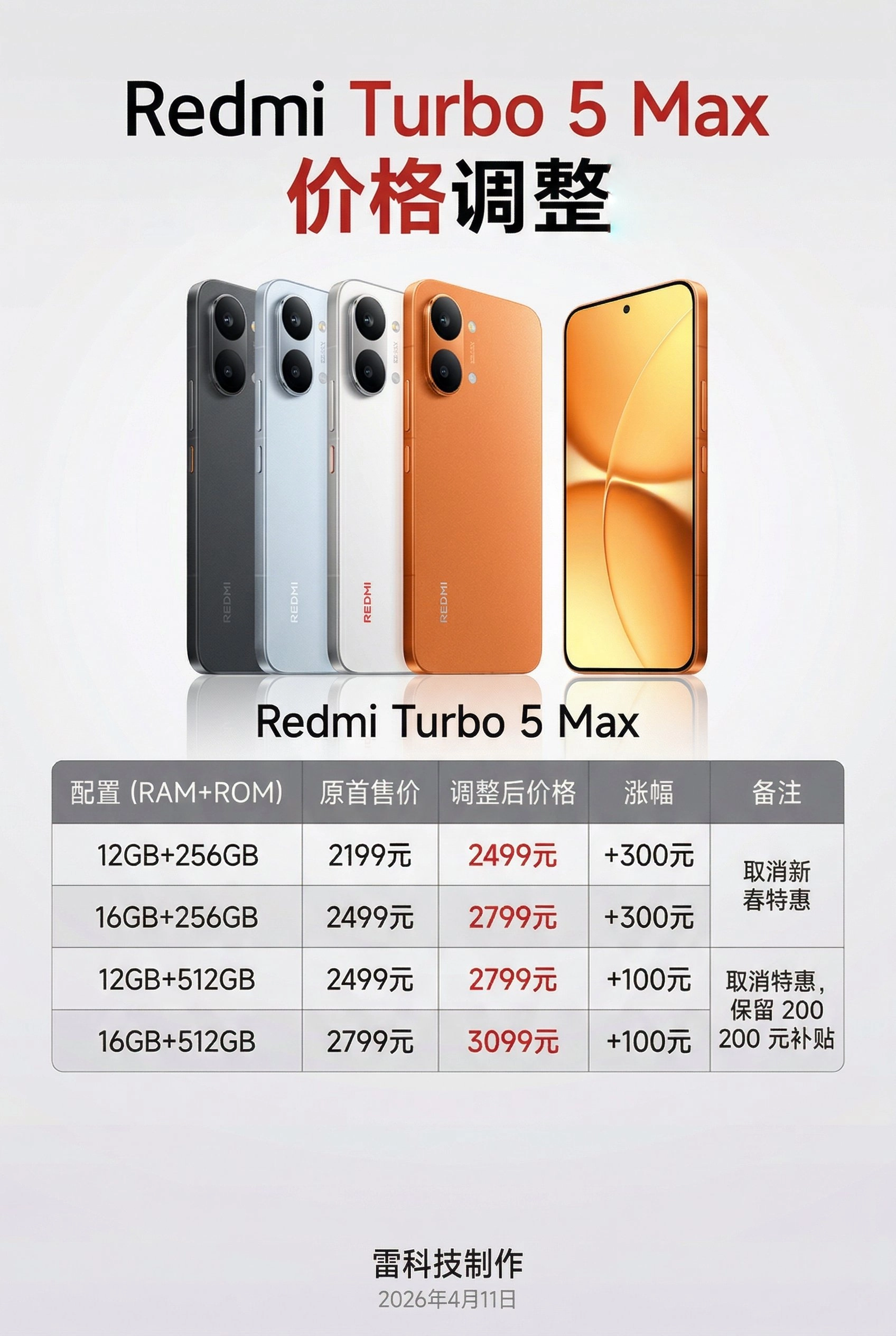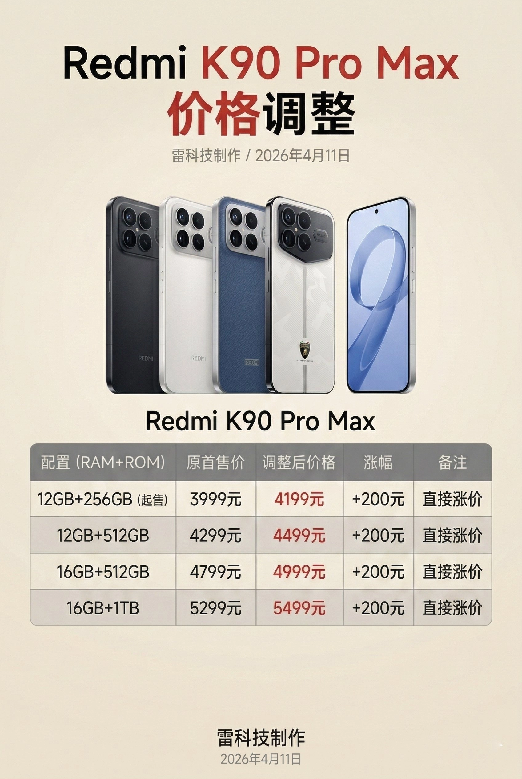 Redmi K90 Pro Max的售价直接上调200元,简单直接。