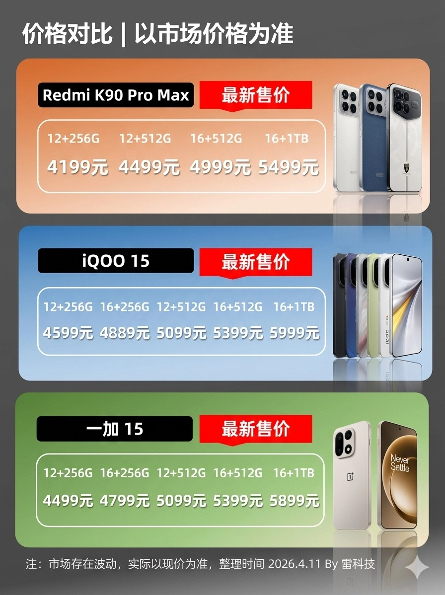 我们简单对比一下:K90 Pro Max涨价后,和iQOO 15以及一加15的价位更加接近,但是依然有着不错的性价比。