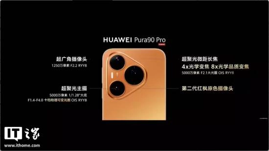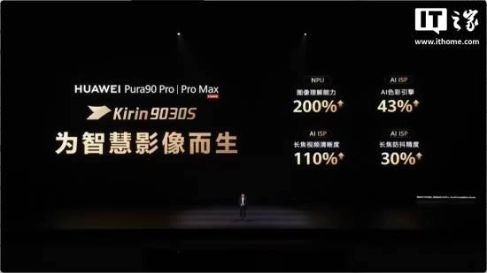 华为 Pura90 Pro | Pro Max 搭载了首发麒麟 9030S 芯片,号称专为智慧影像而生,NPU 图像理解能力提升 200%、AI ISP AI 色彩引擎提升 43%、AI ISP 长焦视频清晰度提升 110%、AI ISP 长焦防抖精度提升 30%。Pura90 Pro 主摄为 5000 万像素(1/1.28 大底、F1.4 - 4.0 十档可变光圈,RYYB),提供 1250 万像素超广角(光圈 2.2,RYYB)、超聚光微距长焦,还提供一颗第二代红枫原色摄像头。