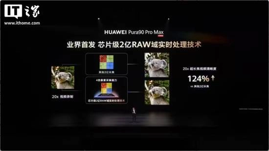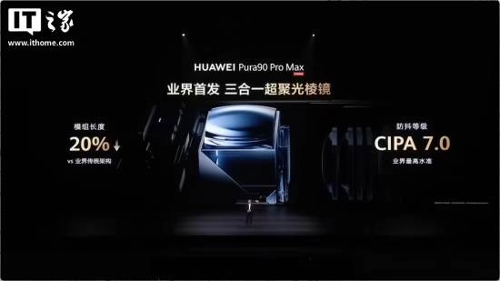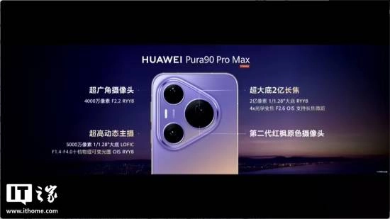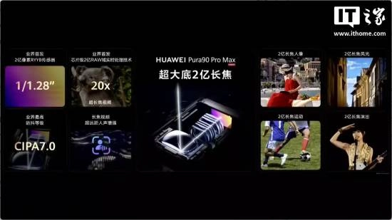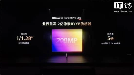 Pura90 Pro Max 采用了超大底 2 亿像素长焦,业界首发 2 亿像素 RYYB 传感器、三合一超聚光棱镜、2 亿 RAW 域实时处理技术,官方称进光量是友商的 5 倍,防抖等级 CIPA7.0。采用“聚光宝盒”主摄,支持 F1.4-F4.0 十档物理可变光圈,动态范围相比友商的 17 Pro Max 高出 16 倍。新机还支持 10 米超远距人声增强。