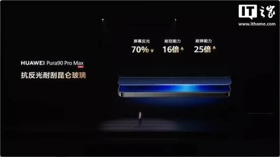 华为 Pura90 Pro Max 采用了抗反光耐刮昆仑玻璃,屏幕反光下降 70%,耐刮能力提升 16 倍,耐摔能力提升 25 倍。