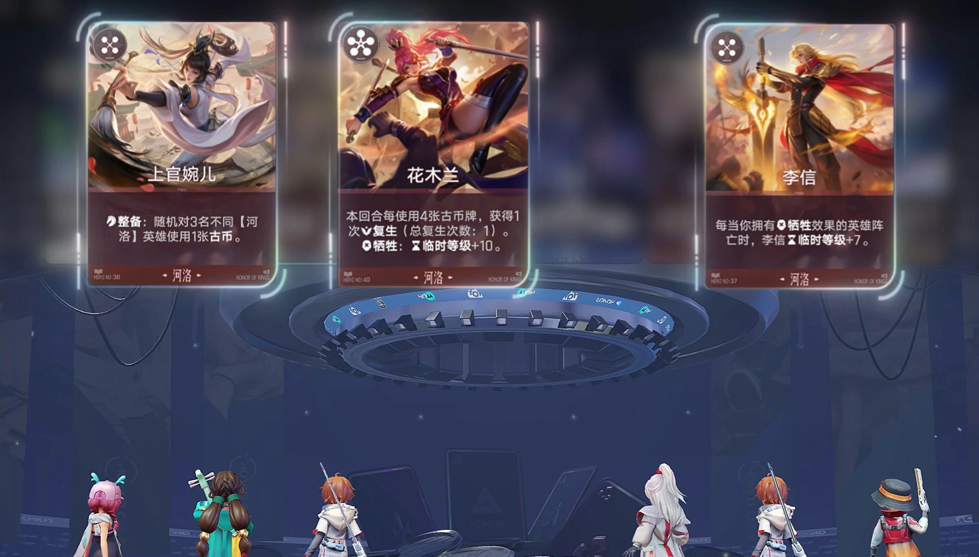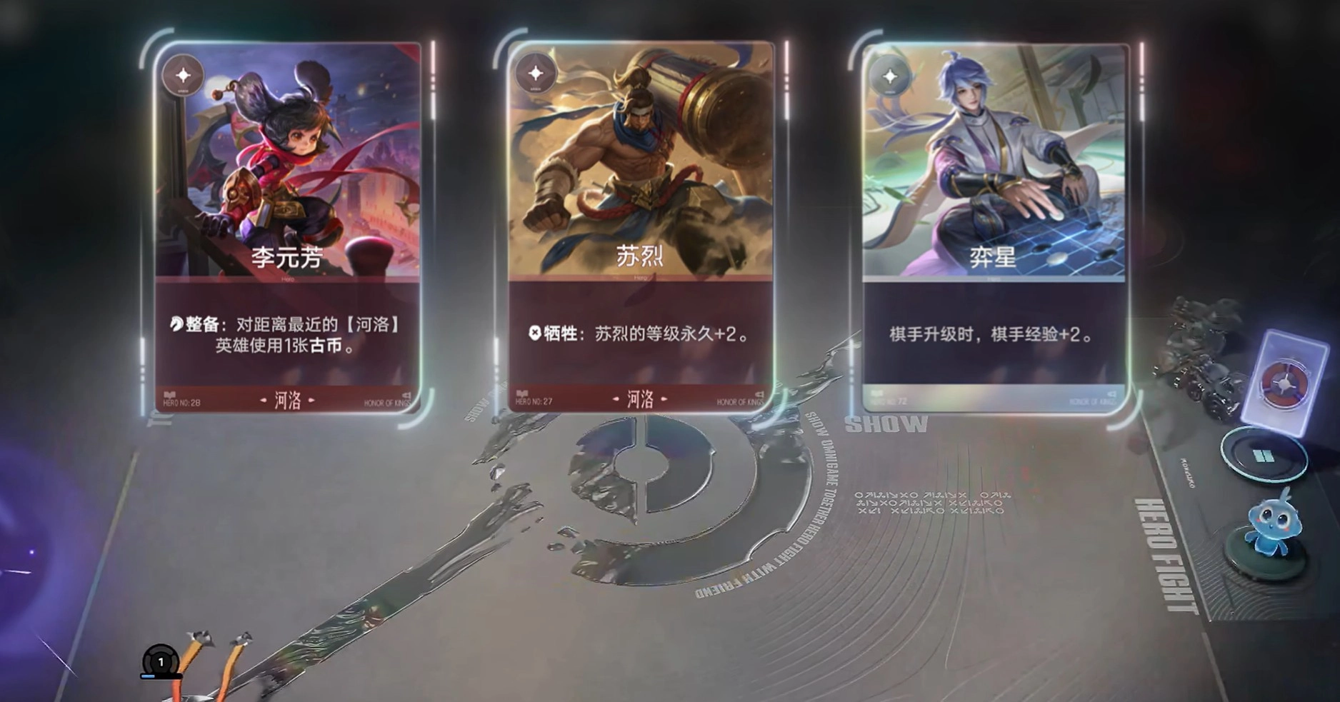 这套阵容的玩法并不复杂:河洛阵营中具备牺牲触发效果的英雄一旦阵亡,就能为李信叠加临时等级,而借助明世隐的卡牌机制,这些临时等级可以转化为永久等级——简言之,阵亡的牺牲类英雄数量越多,李信的升级速度就越快。游戏前期(1-3回合)的核心目标是提升自身等级,优先选择李元芳、苏烈,再搭配一张奕星,能进一步加快升级节奏;若遇到钟馗、铠也可收入囊中,助力平稳度过前期。首次拍卖时,建议优先考虑河洛阵营的牺牲类英雄或明世隐。
