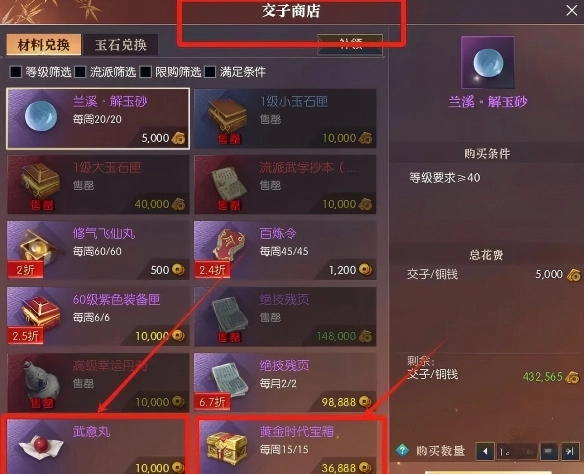 1、第一步,进入【交子商店】,点击【材料兑换】,找到【武意丸】。