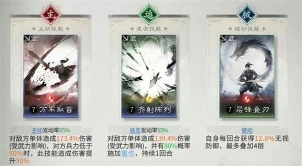 3、技能方面许褚推荐万军取首+齐射陈列+层锋叠刃,周泰推荐向死而生+首尾相援,关平推荐缮甲厉兵+深仁厚泽+轻装驰援。