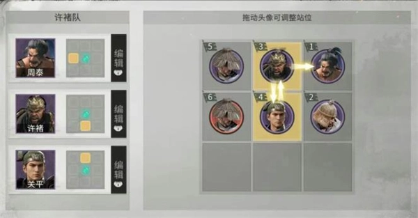 2、站位方面周泰不占用追击格,许褚必须放在周泰的追击格内,关平与许褚互相站位在追击格内,最大化触发追击输出。