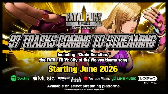 《饿狼传说:群狼之城》的乐曲将在各大音乐流媒体平台中上线。预计收录包括主题曲《Chain Reaction》在内的全部97首曲目。