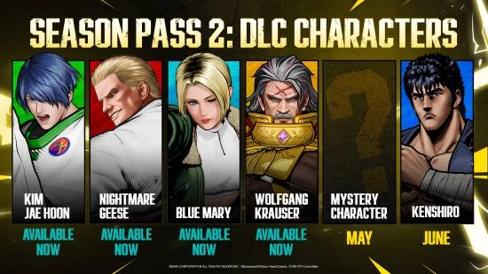 在季票2中,将会逐月上线来自《饿狼传说》系列的4个角色:“金在勋”“噩梦吉斯”“布鲁·玛丽”“沃尔夫冈·克劳萨”,以及来自动画《北斗神拳 -FIST OF THE NORTH STAR-》的“拳四郎”已确定参战。此外,还包括后续将公布的1位神秘角色,共计6个角色。