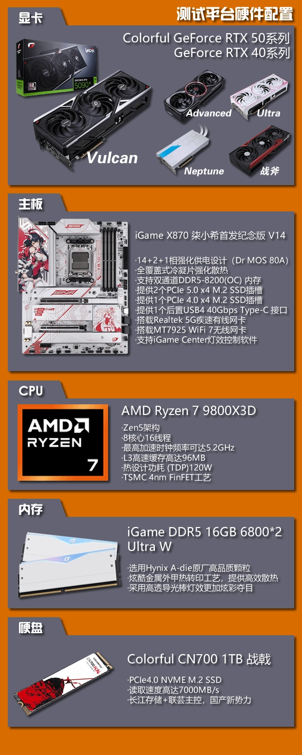 测试平台我们选择了七彩虹全家桶,CPU为目前游戏性能数一数二的AMD锐龙7 9800X3D,搭配的主板为七彩虹iGame X870柒小希首发纪念版V14,可以充分释放锐龙7 9800X3D的强大游戏性能,内存为一对iGame Ultra W 16GBx2套条,采用海力士A-die颗粒,我们将其手动调参至6000 C30,使测试结果更具参考性。