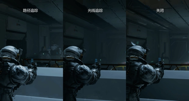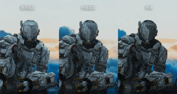 在开启路径追踪的最左侧画面中,环境光遮蔽和间接照明的精确度,盔甲缝隙、关节转折处以及手部虎口位置的阴影深邃且富有层次感,呈现出了自然的物理遮蔽效果。同时,盔甲白色外壳上的漫反射光线更加柔和,金属部件之间的相互反射细节得到了保留,使得整个角色的立体感极强。单纯的光线追踪的效果则稍逊,相比关闭状态,它提供了基本的光影校正,特别是在金属材质的反射和局部阴影上有所增强。但与路径追踪相比,其阴影边缘显得略微生硬,某些区域的间接光照覆盖不足,导致材质的质感表现虽然优于基础画质,但仍缺乏那种与环境融为一体的厚重感。