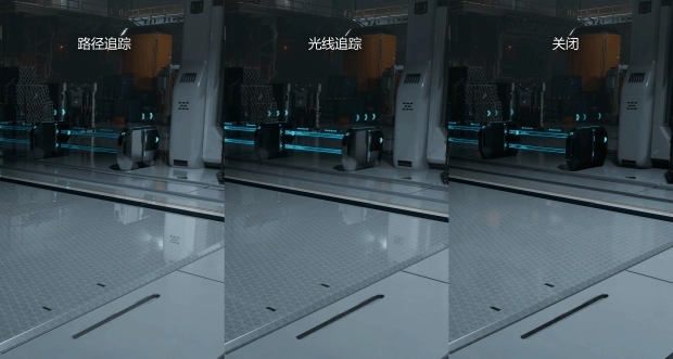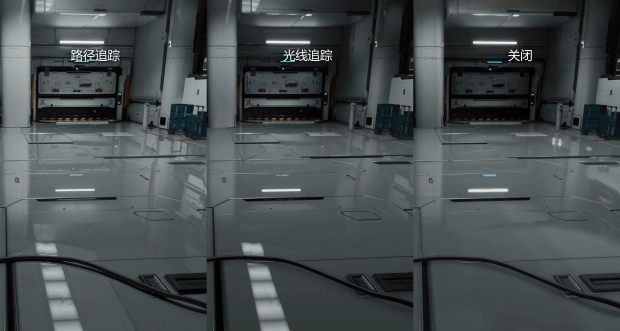 可以说,路径光追在这种光影效果纷杂的科幻场景中对于整体氛围的提升是巨大的。在上方两张截图的对比中,路径追踪实现了完美的全局反射,地面不仅能清晰地倒映出顶部的长条灯管,连远处闸门上的细微橙色标识和结构线条都精准可见。相比之下,普通光线追踪的反射显得较为模糊,灯管倒影出现了明显的扩散,丢失了边缘锐度。而关闭光追后,地面反射完全依赖于预设的屏幕空间反射,效果聊胜于无。