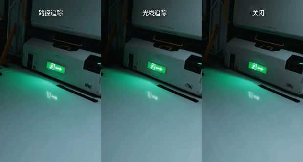 虽然开关路径光追在绝大多数情况下判若两款游戏,但是也有些场景,三者不会出现明显区别,例如上图的安全出口灯,绿色光源产生的溢色与地面倒影在三种模式下观感极其接近,传统渲染技术甚至是非光追预烘焙效果都能提供不错的视觉反馈,路径追踪在光影物理逻辑上的严密性在这种单一光源环境下很难拉开肉眼可见的差距。